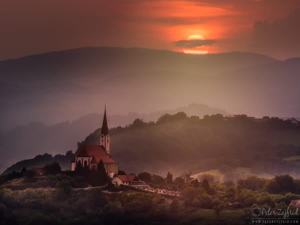 Last light at Sunset over the Malečnik church, Slovenia