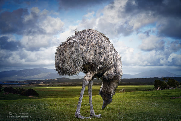 A wild emu forages for foliage on the open grassland at Wilsons Promontory in Victoria.
