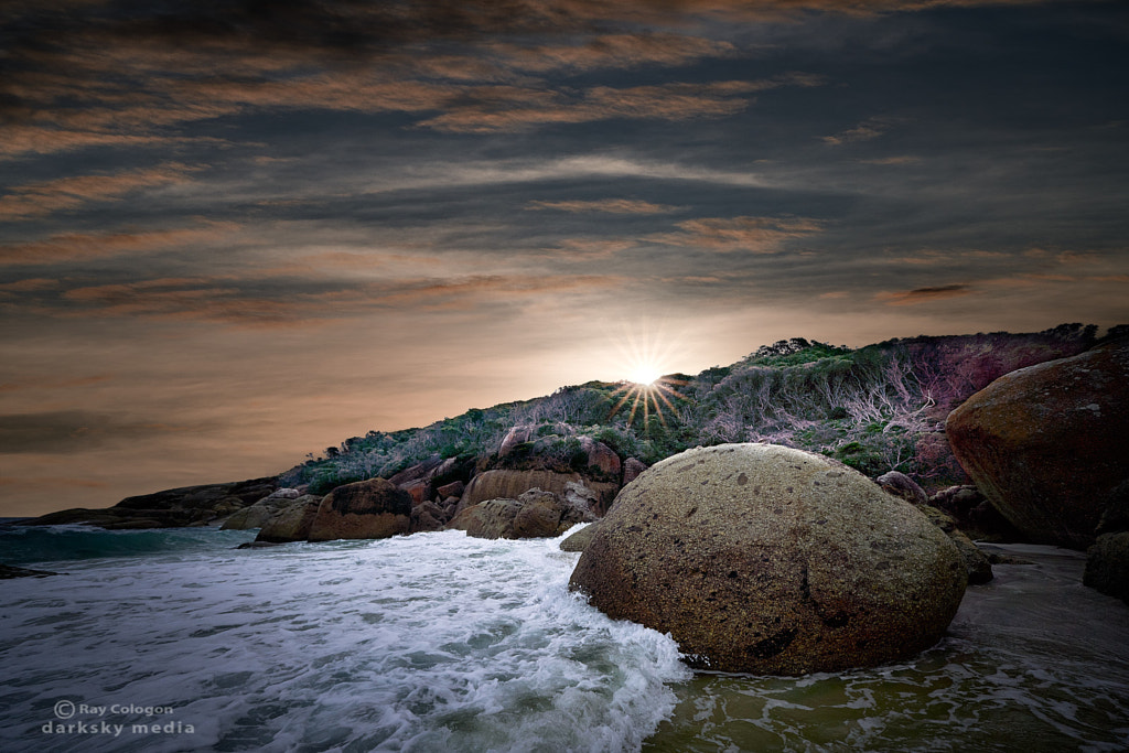 Last glancing rays across the headland of Leonard Bay on Wilsons Promontory in Victoria.