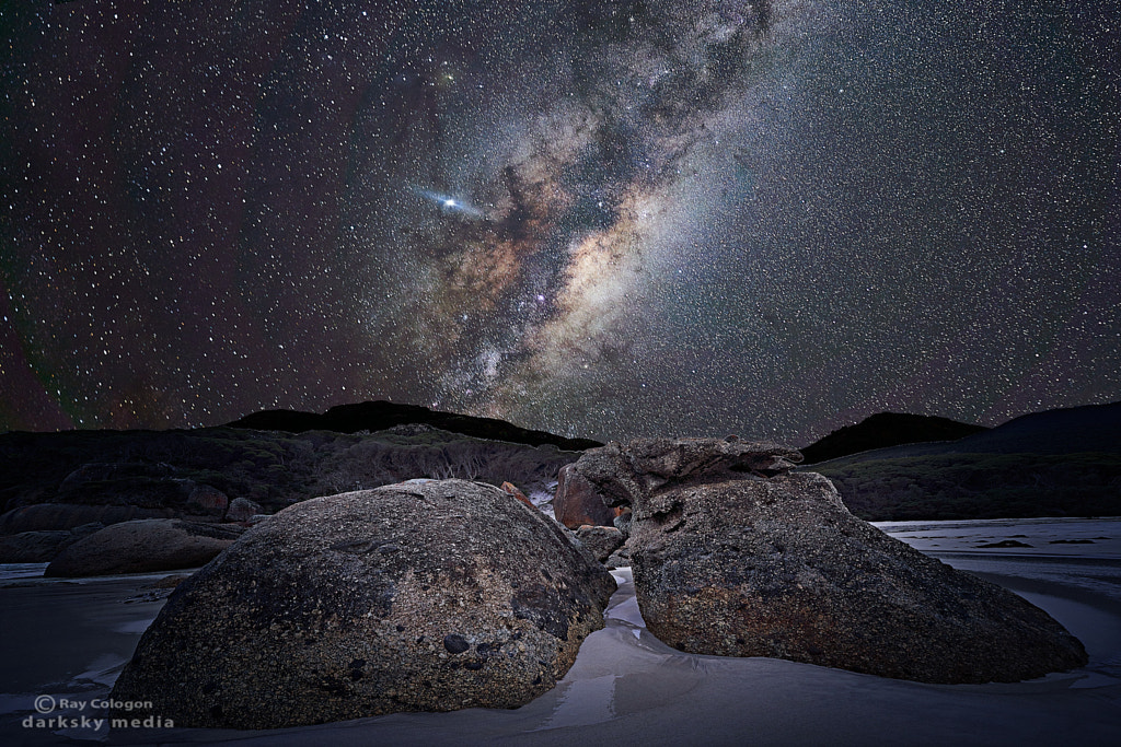 The deep night sky in Winter from the edge of Leonard Bay at Wilsons Promontory in Victoria.