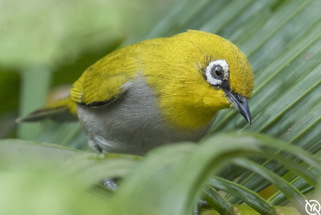 A Oriental White Eye Bird sitting on a Palm and looking into the camera, must be asking have come to click her after a long time