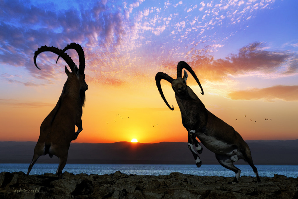 Nubian Ibex Fighting for Mate at Sunrise by ITG photography