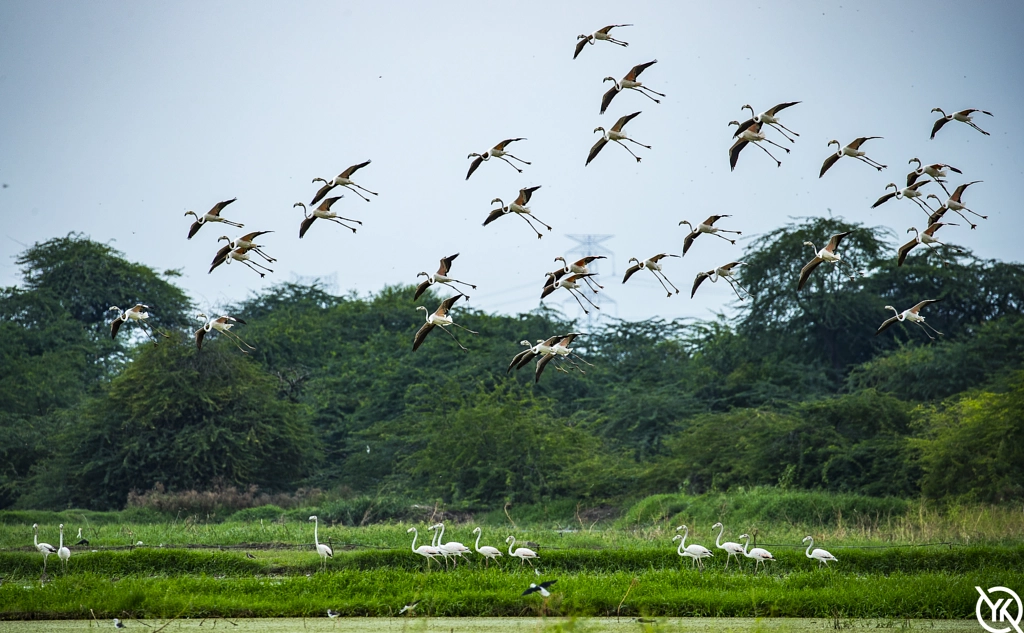 A group of Flamingos landing in the field.