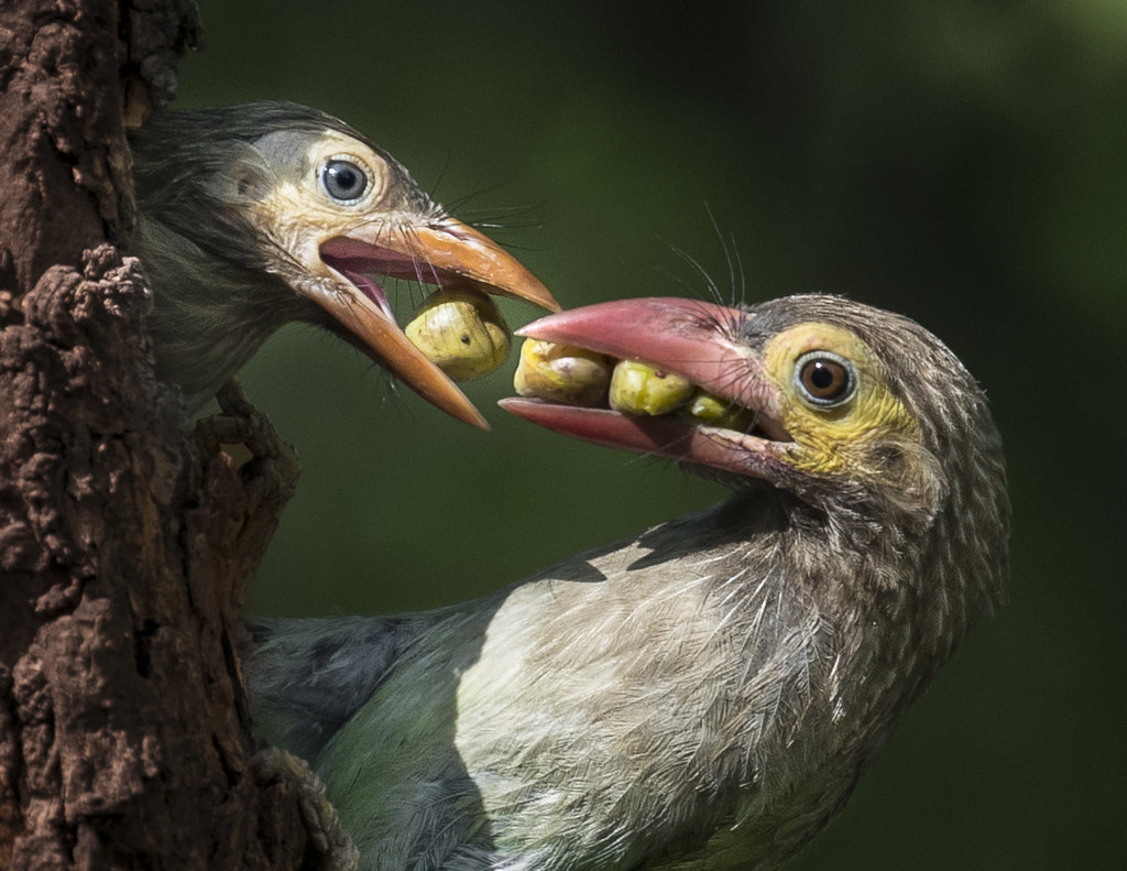 A Brown Headed Barbet feeding her juvenile. Her affection is pouring from eyes.