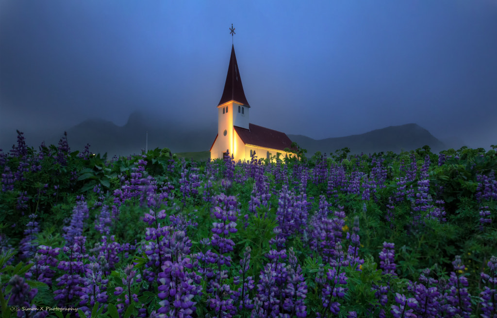 Beacon In the Rain by Simon W Xu It was a cold raining day. But the warm glow of church lighted up the environment like a beacon. The lupine flowers were especially lovely in the foggy night. Simon W Xu: Photos