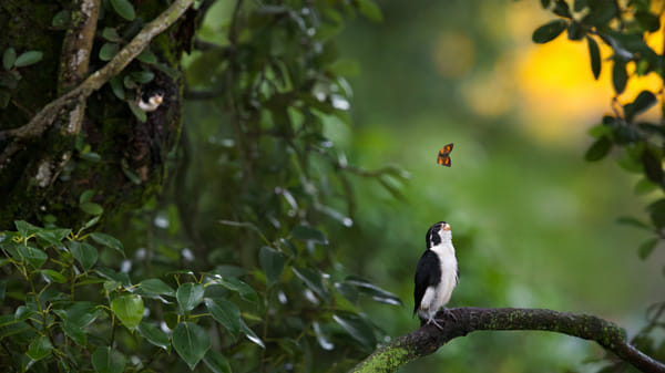 在中国南方的落叶森林里,一只刚出巢不久的白腿小隼幼鸟正好奇地打量着上下翻飞的蝴蝶;而他的小兄弟则从巢里探出头来,对外面的世界迫不及待跃跃欲试。